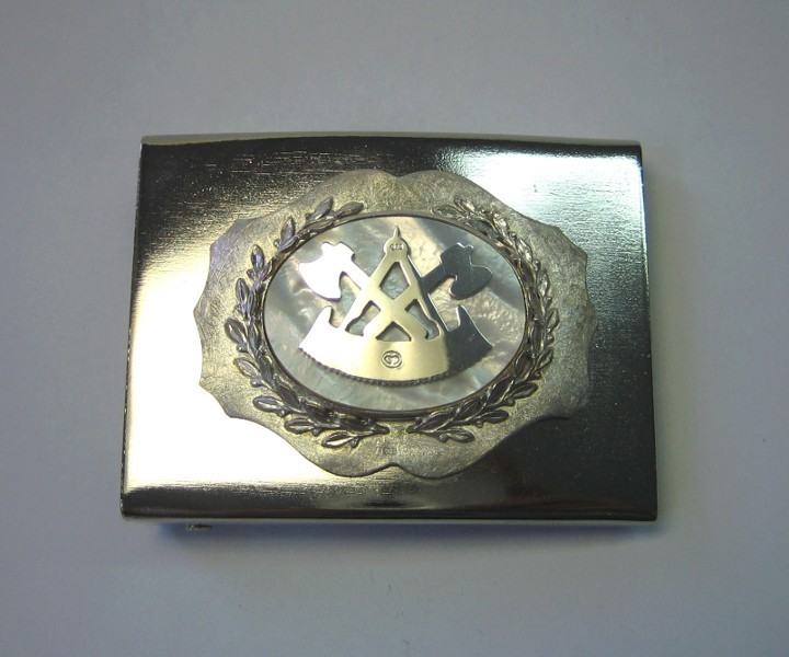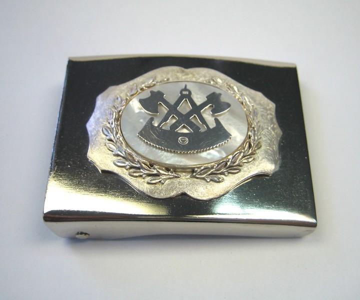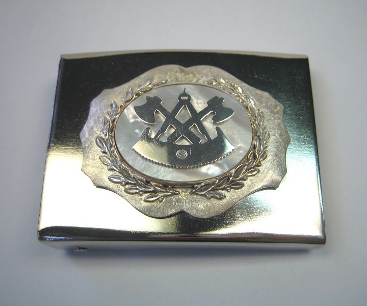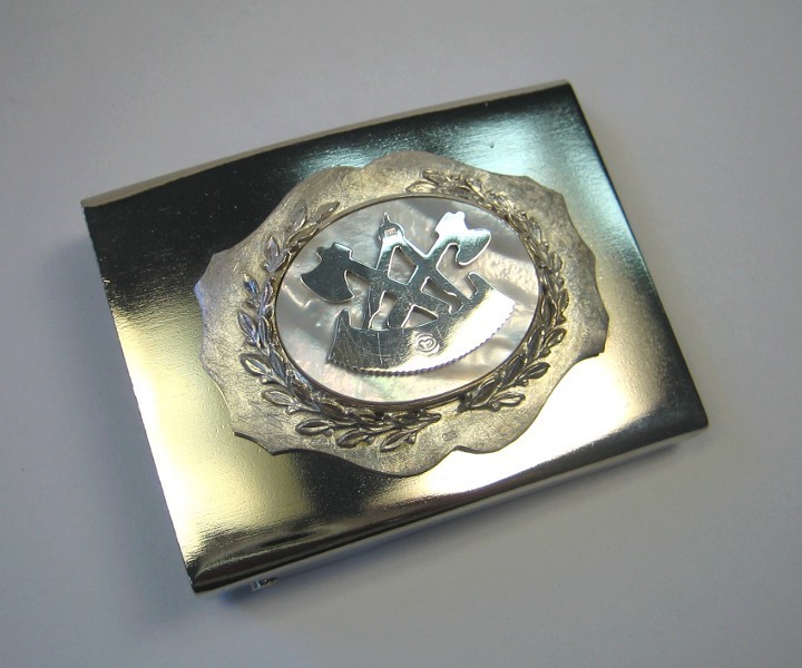 Diese Gürtelschnalle zeigt das Zunftzeichen der Zimmerer. Das Zunftzeichen ist mit Perlmutt unterlegt und wird von zwei Lorbeerzweigen umrahmt.