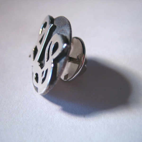 Bei diesem Pin ist die Grundfläche überschmort und geschwärzt, die Initialen poliert.